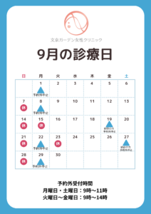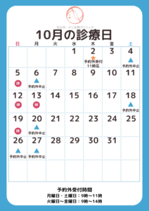 当日急遽、予約外診療を中止する場合がございます。ご来院前に、カレンダーのご確認をお願いいたします。